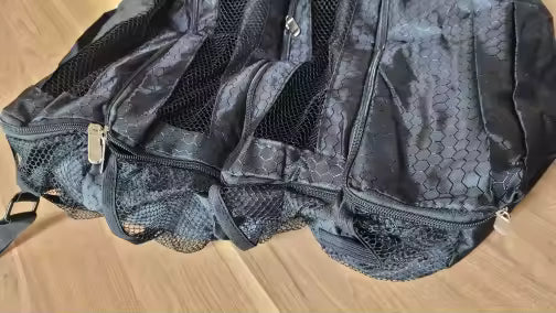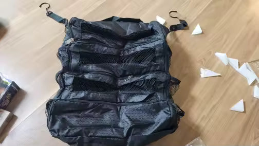 Lo que más me gusta es que puedes apretar las correas laterales para compactarlo todo antes de meterlo en la maleta. Reduce el volumen real un 20-30%. Ojo, los ganchos para colgar son de metal, no de plástico, lo cual es un puntazo porque aguantan mucho peso. Llegó bien embalado.